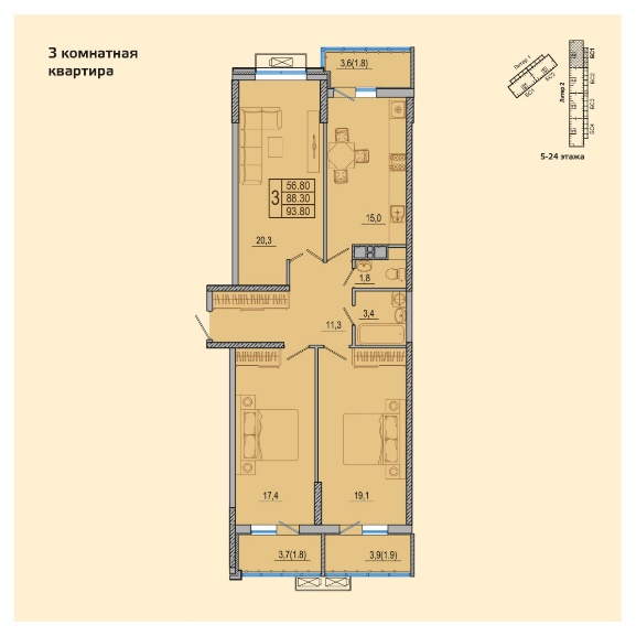 Трехкомнатная квартира Площадь – 93.80 м² |