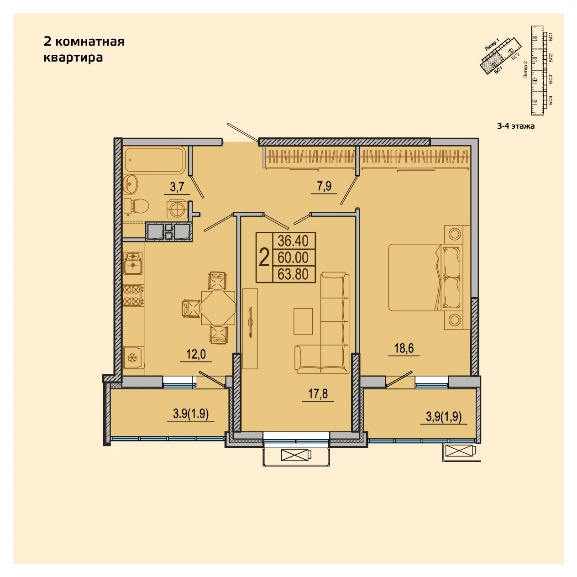 | Двухкомнатная квартира Площадь – 63.80 м² |