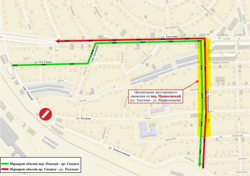 Пер. Озимый — ул. 9-я Улица — пер. Громкий — ул. Текучева — пер. Приволжский (организовано двустороннее движение на участке от ул. Текучева до ул. Варфоломеева) — ул. Локомотивная — пр. Сиверса.
