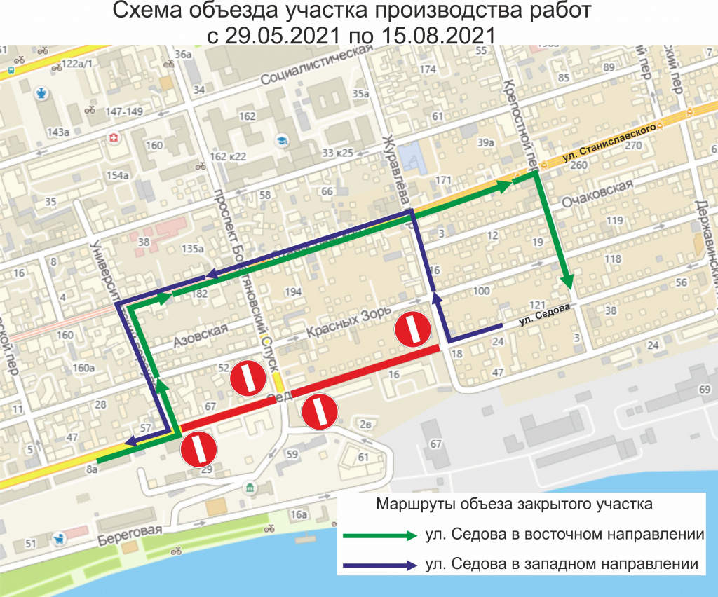 Кроме этого, ул. Седова будет перекрыта на участке от Богатяновского Спуска до переулка Журавлева.