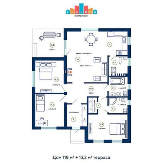 - Увеличена площадь технических помещений (кладовая/котельная) и санузлов;
