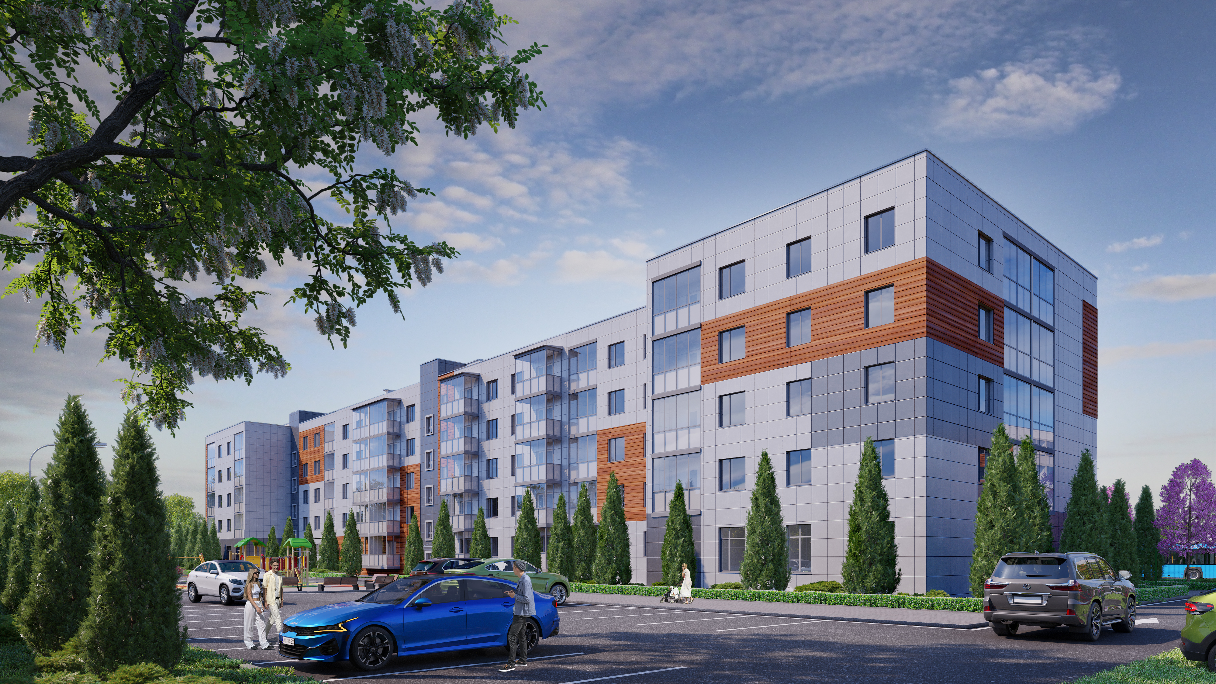 На территории ЖК «Донской» есть уютные места для прогулок, отдыха и общения с семьей и друзьями, а также современные детские площадки и спортивные зоны. Зеленые насаждения, аккуратные газоны, цветы и кустарники создают приятную атмосферу. Территория закрыта для обеспечения безопасности жителей. Предусмотрены парковочные места из расчета одно место на одну квартиру.